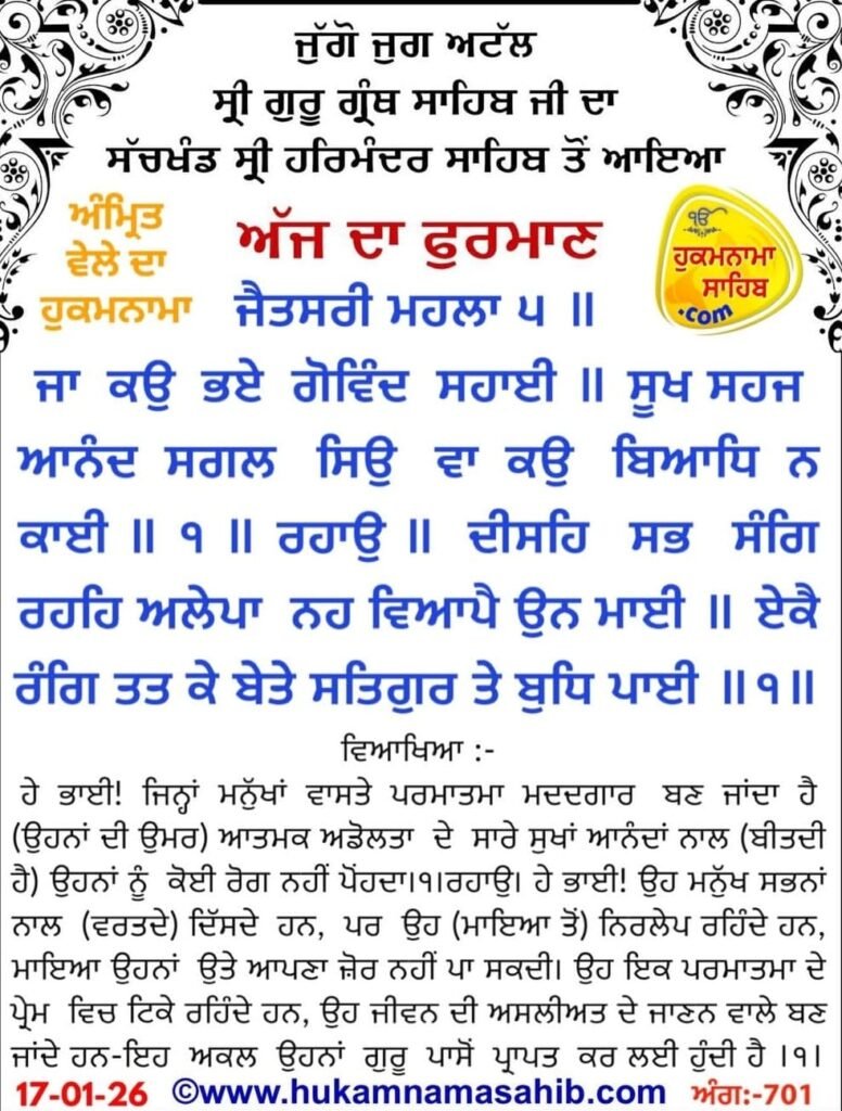 ਅਜ ਦਾ ਮੁੱਖਵਾਕ ਸ੍ਰੀ ਦਰਬਾਰ ਸਾਹਿਬ ਤੋਂ ਅੱਜ ਦਾ ਹੁਕਮਨਾਮਾ। By sgnrmanusgnr@gmail.com January 17, 2026 5:06 PM ---Advertisement---