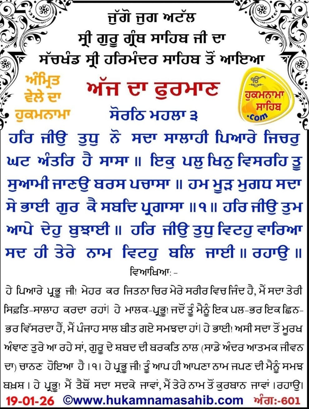 ਅਜ ਦਾ ਮੁੱਖਵਾਕ ਸ੍ਰੀ ਦਰਬਾਰ ਸਾਹਿਬ ਤੋਂ ਅੱਜ ਦਾ ਹੁਕਮਨਾਮਾ। ਸ੍ਰੀ ਦਰਬਾਰ ਸਾਹਿਬ ਤੋਂ ਅੱਜ ਦਾ ਹੁਕਮਨਾਮਾ। By sgnrmanusgnr@gmail.com January 19, 2026 10:42 AM ---Advertisement--- ਸ੍ਰੀ ਦਰਬਾਰ ਸਾਹਿਬ ਤੋਂ ਅੱਜ ਦਾ ਹੁਕਮਨਾਮਾ।