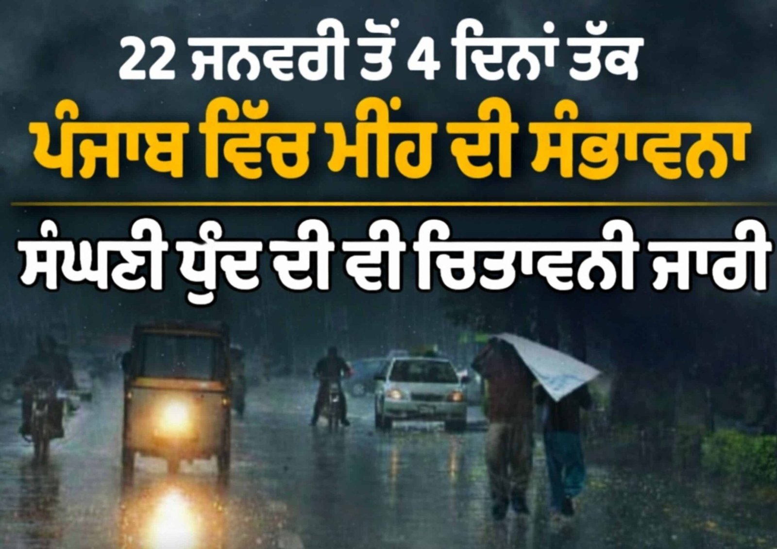 ਪੰਜਾਬ ਵਿੱਚ ਆਉਣ ਵਾਲੇ ਦਿਨਾਂ ਦੌਰਾਨ ਮੌਸਮ ਇੱਕ ਵੱਡਾ ਮੋੜ ਲੈਣ ਜਾ ਰਿਹਾ ਹੈ। ਮੌਸਮ ਵਿਭਾਗ ਦੇ ਤਾਜ਼ਾ ਅਨੁਮਾਨ ਮੁਤਾਬਕ 22 ਜਨਵਰੀ ਤੋਂ ਅਗਲੇ ਚਾਰ ਦਿਨਾਂ ਤੱਕ ਸੂਬੇ ਦੇ ਕਈ ਹਿੱਸਿਆਂ ਵਿੱਚ ਮੀਂਹ ਪੈਣ ਦੀ ਸੰਭਾਵਨਾ ਬਣੀ ਹੋਈ ਹੈ। ਇਸ ਦੇ ਨਾਲ ਹੀ ਸਵੇਰੇ ਅਤੇ ਰਾਤ ਦੇ ਸਮੇਂ ਸੰਘਣੀ ਧੁੰਦ