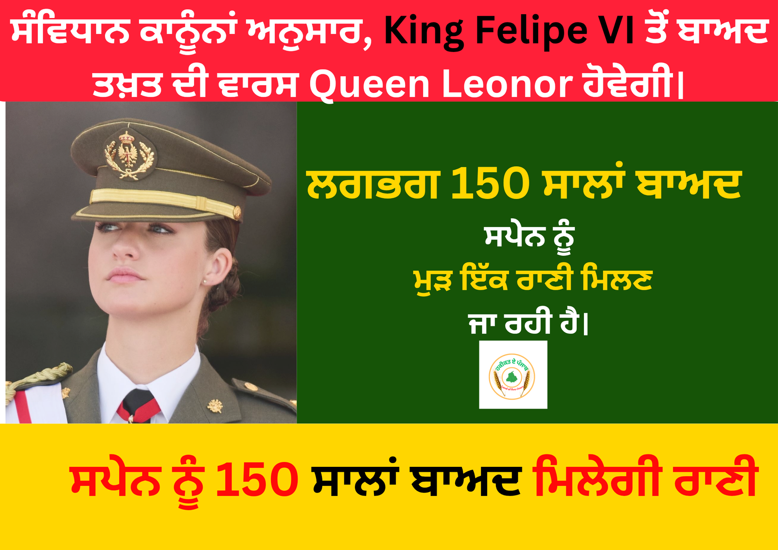 ਸਪੇਨ ਦੇ ਇਤਿਹਾਸ ਵਿੱਚ ਇਤਿਹਾਸਕ ਮੋੜ ਆਉਣ ਵਾਲਾ ਹੈ। ਲਗਭਗ 150 ਸਾਲਾਂ ਬਾਅਦ ਸਪੇਨ ਨੂੰ ਮੁੜ ਇੱਕ 👑ਰਾਣੀ ਮਿਲਣ ਜਾ ਰਹੀ ਹੈ। ਇਹ ਰਾਣੀ ਹੋਵੇਗੀ ਰਾਜਕੁਮਾਰੀ (Leonor) ਜੋ ਮੌਜੂਦਾ ਬਾਦਸ਼ਾਹ (king ਫੀਲਿੰਪੇ VI) ਅਤੇ ਰਾਣੀ (letizia) ਦੀ ਧੀ ਹੈ। ਇਹ ਖ਼ਬਰ ਸਿਰਫ਼ ਸਪੇਨ ਲਈ ਹੀ ਨਹੀਂ, ਸਗੋਂ ਪੂਰੇ ਯੂਰਪ ਲਈ