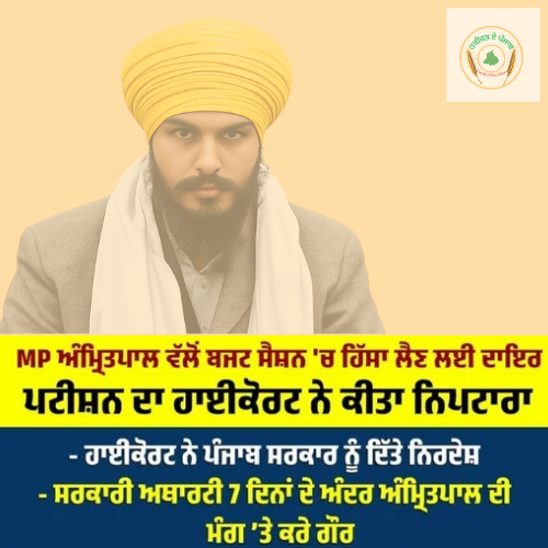 ਸੰਸਦ ਮੈਂਬਰ ਅੰਮ੍ਰਿਤਪਾਲ ਵੱਲੋਂ ਬਜਟ ਸੈਸ਼ਨ ਵਿੱਚ ਸ਼ਾਮਿਲ ਹੋਣ ਲਈ ਦਾਇਰ ਕੀਤੀ ਗਈ ਪਟੀਸ਼ਨ’ ਤੇ ਪੰਜਾਬ ਅਤੇ ਹਰਿਆਣਾ ਹਾਈਕੋਰਟ ਨੇ ਮਹੱਤਵਪੂਰਨ ਹੁਕਮ ਜਾਰੀ ਕਰਦੇ ਹੋਏ ਮਾਮਲੇ ਦਾ ਨਿਪਟਾਰਾ ਕਰ ਦਿੱਤਾ ਹੈ। ਅਦਾਲਤ ਨੇ ਇਸ ਮਾਮਲੇ ਵਿੱਚ ਪੰਜਾਬ ਸਰਕਾਰ ਅਤੇ ਸੰਬੰਧਿਤ ਸਰਕਾਰੀ ਅਥੋਰਟੀ ਨੂੰ ਸਪਸ਼ਟ ਨਿਰਦੇਸ਼ ਦਿੱਤੇ ਹਨ ਕਿ ਉਹ ਅੰਮ੍ਰਿਤਪਾਲ