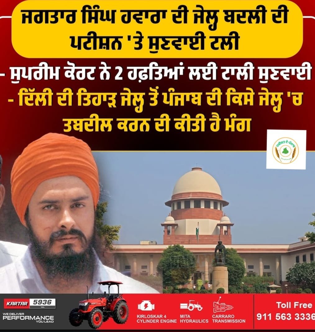 ਜਗਤਾਰ ਸਿੰਘ ਹਵਾਰਾ ਨਾਲ ਜੁੜੇ ਕਾਨੂੰਨੀ ਮਾਮਲੇ ਵਿੱਚ ਇੱਕ ਵਾਰ ਫਿਰ ਕੋਈ ਠੋਸ ਨਤੀਜਾ ਸਾਹਮਣੇ ਨਹੀਂ ਆ ਸਕਿਆ। ਉਨ੍ਹਾ ਵੱਲੋਂ ਦਾਖਲ ਕੀਤੀ ਗਈ ਜੇਲ ਬਦਲੀ ਸਬੰਧੀ ਪਟੀਸ਼ਨ ‘ ਤੇ ਹੋਣੀ ਸੀ ਅਦਾਲਤੀ ਸੁਣਵਾਈ ਮੁੜ ਟਾਲ ਦਿੱਤੀ ਗਈ ਹੈ।